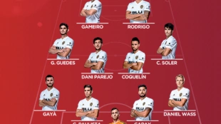 El once titular del Valencia contra la Real, Rodrigo Moreno y 10 más